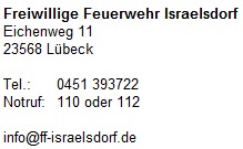 Diese Homepage dient dazu, unter nichtkommerziellen Aspekten Informationen über den Aufbau und die Tätigkeit der Freiwilligen Feuerwehr Israelsdorf zu vermitteln. Eine offizielle Homepage des Stadtfeuerwehrverbandes der Hansestadt Lübeck erreichen Sie unter www.feuerwehr-luebeck.de.